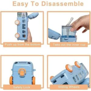 The movable wheels at the bottom add a fun, toy-like element, allowing the bottle to double as a mini bus toy when not in use. The included shoulder strap makes it easy for kids to carry on their own, and the leak-proof design ensures no messy spills.